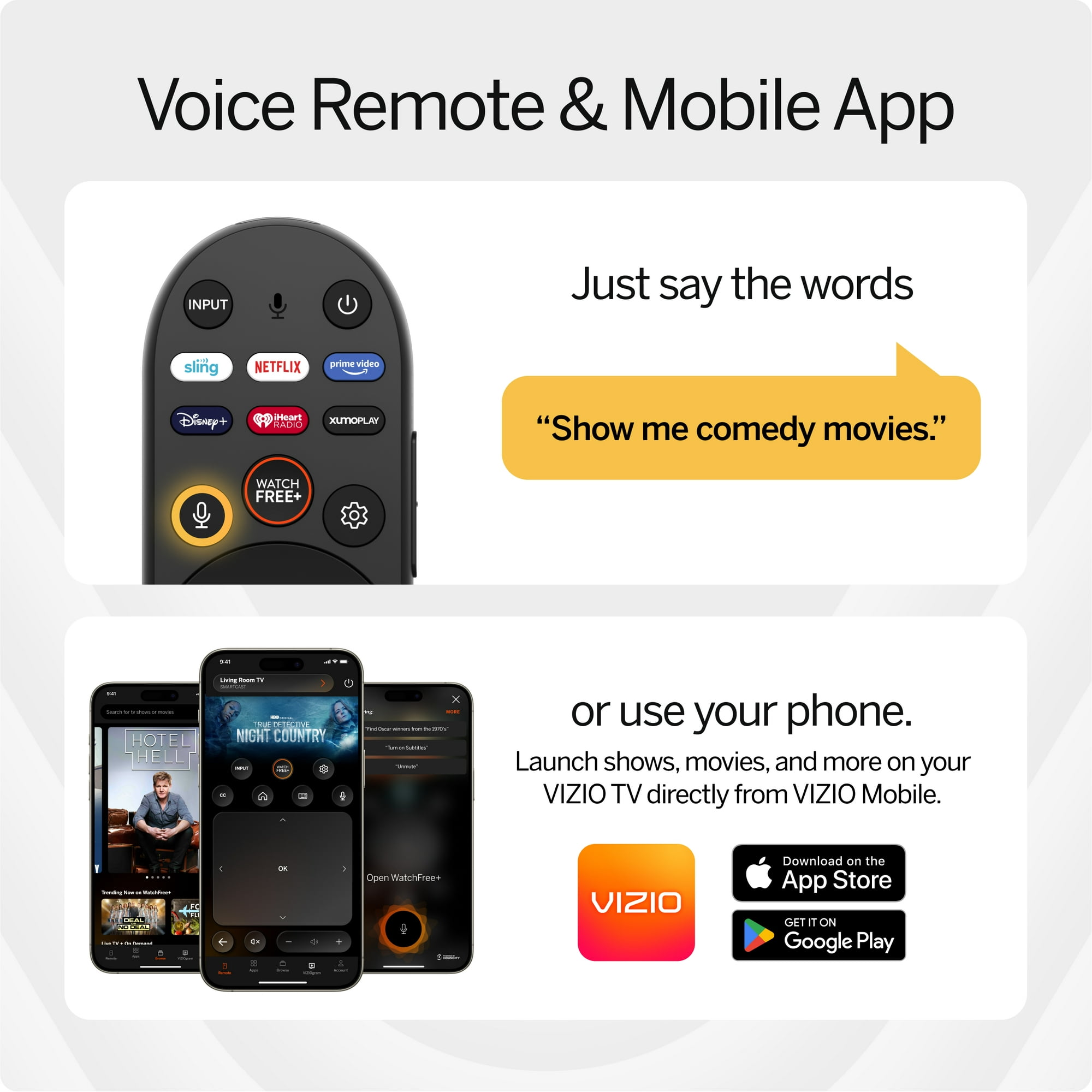 - SmartCast With lightning fast navigation, enjoy instant access to the best selection of apps from top-tier streaming services like Netflix, Disney+, YouTube, and many more right on the TV using the all-new smart remote or SmartCast Mobile app.